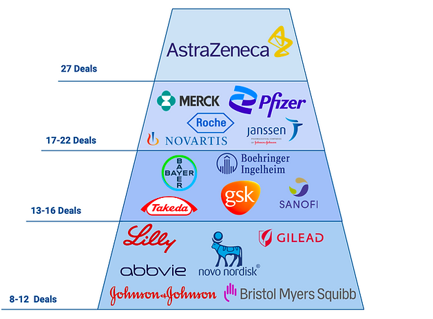 作为行业里有名的“AI发烧友”,阿斯利康早在2023年,就凭借27项合作成为AI合作最多的跨国药企,近两年也陆续与科技公司加深合作,但首付款普遍在5000万美元以下,总金额也在10亿美元上下浮动。