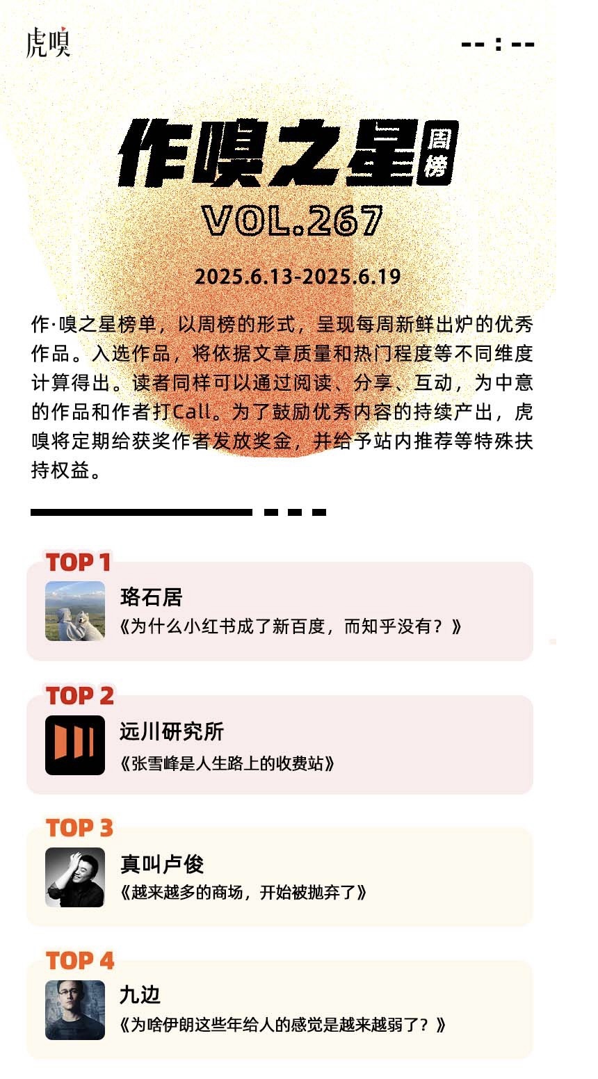 作·嗅之星榜单,以周榜的形式,呈现每周新鲜出炉的优秀作品。2025年6月13日~2025年6月19日,虎嗅第267期,作·嗅之星的获奖文章分别是: