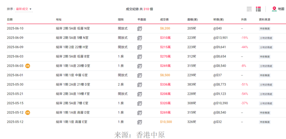 据香港中原网信息,截至6月17日,缇岸项目的不少二手房源价格跌幅超过50%。如5月21日成交的一套2期3A座19楼的房源,面积为228平方呎,成交价为208万港元,较买入时的价格下跌约54%。