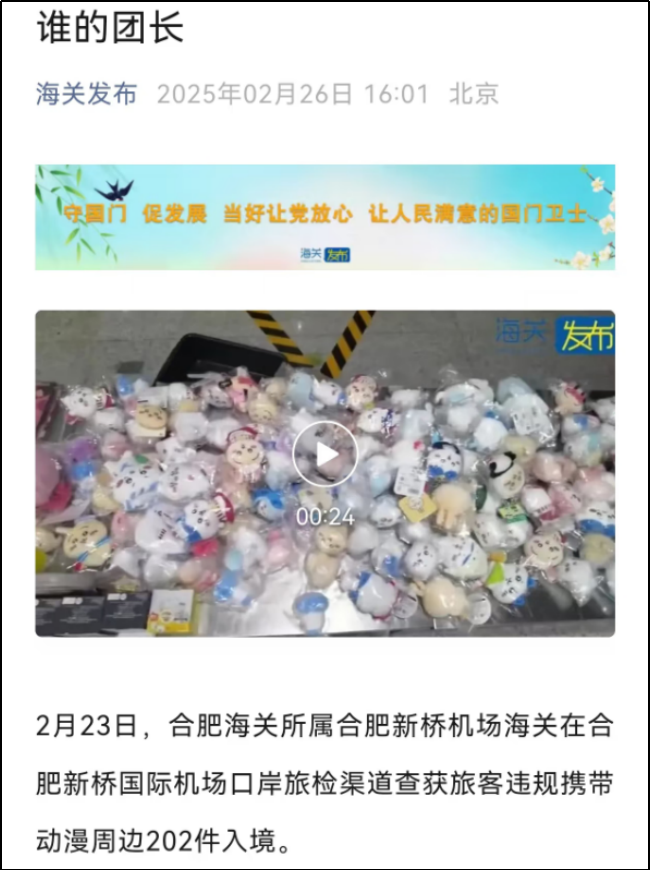 问你谁的团长,其实是他们发现,有人带了两百个乌萨奇玩偶违规入境。