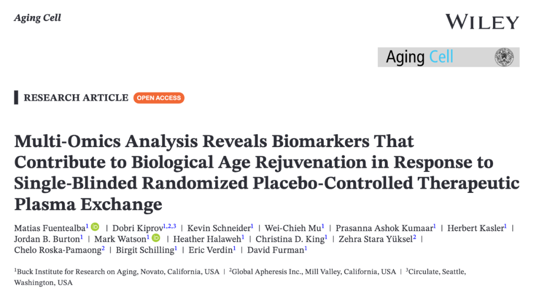 该研究以:Multi-Omics Analysis Reveals Biomarkers That Contribute to Biological Age Rejuvenation in Response to Single-Blinded Randomized Placebo-Controlled Therapeutic Plasma Exchange 为题,发表在了 Aging Cell 期刊。