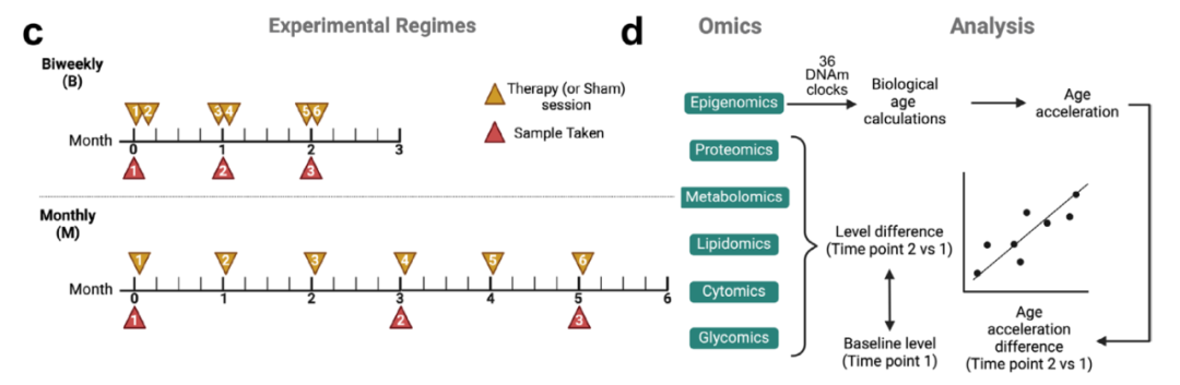 该研究的主要目标是评估长期 TPE 治疗的安全性以及生物钟的变化,次要目标包括确定最佳治疗方案。该研究探索性分析描绘了表观基因组、蛋白质组、代谢组、糖组、免疫细胞因子、免疫年龄(iAge)和免疫细胞组成的基线临床特征以及随时间的变化情况。