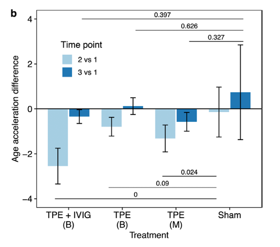 其中,每两周一次的治疗性血浆置换联合静脉注射免疫球蛋白(TPE-IVIG)被证明最为有效,它能诱导细胞和分子的协同反应,逆转了年龄相关免疫功能衰退,并调节与慢性炎症相关的蛋白质。