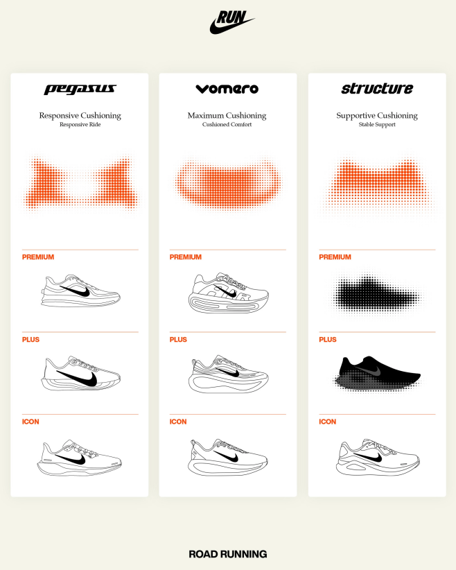 耐克今年重构了路跑产品矩阵,并划分为三类由其代表性类别进行展示——耐克飞马(Pegasus)系列主打回弹缓震,Structure系列主打支撑缓震,耐克迈柔(Vomero)系列主打超强缓震。