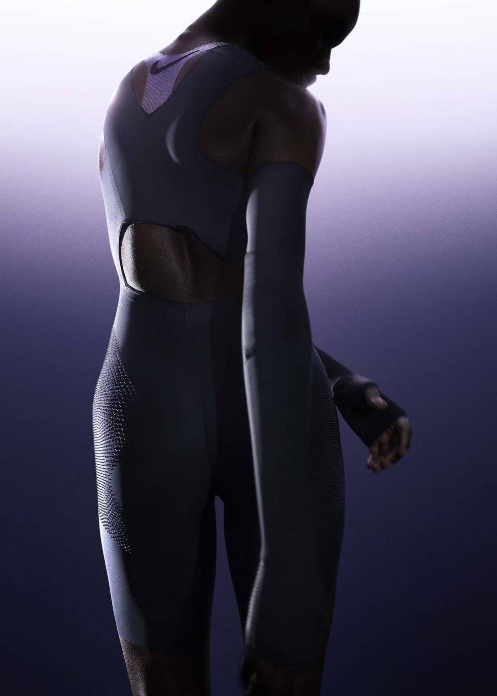作为当前耐克创新科技中最符合空气动力学的服装系统,Fly Suit 通过了计算机模拟和物理风洞试验对材料和运动进行的严格测试,其中最具创新的则是遍布身体关键区域的3D打印 Aeronodes,通过精准布局提升速度,并在她身后创造更小的漩涡,以减少阻力。