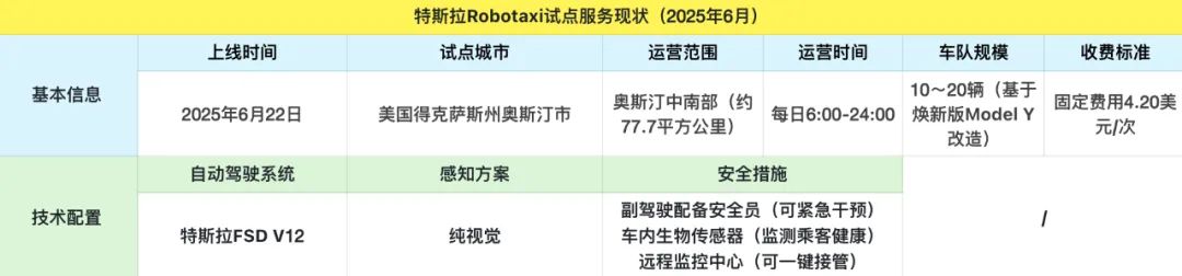 根据特斯拉官网信息,特斯拉针对此次试点服务初期投入的车队规模约10~20辆车,均基于焕新版Model Y车型改造,并搭载最新的HW5.0硬件和FSD(Full Self-Driving)V12软件系统,暂未采用此前发布的Cybercab车型。