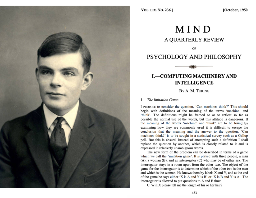 ▷图2:左,艾伦·图灵(1912-1954),英国计算机科学家、数学家,“计算机科学之父”、“人工智能之父”。右,艾伦·图灵的著名论文《Computing Machinery and Intelligence》,开创了当代人工智能领域。