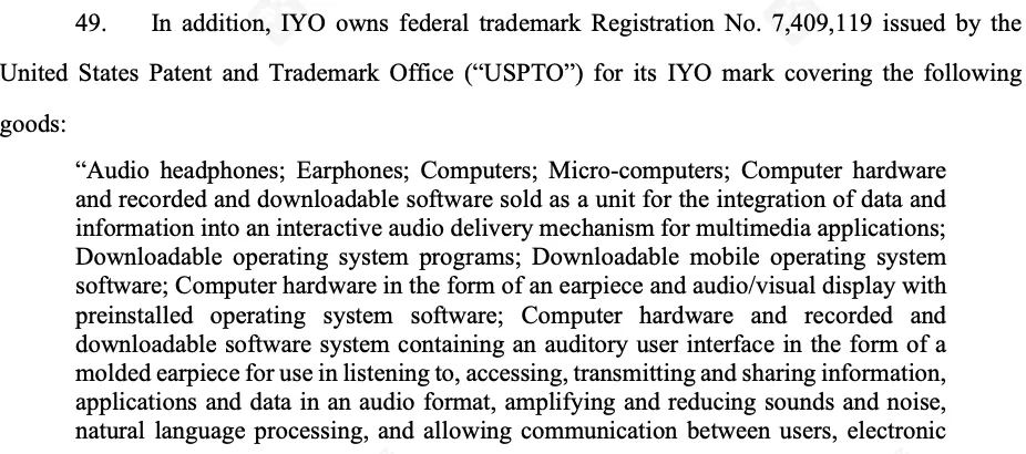 就商标领域而言,按照IYO的说法,他们早在2021年9月申请了IYO商标,2024年6月获批,涵盖音频耳机,计算机、电子设备与无线设备等服务。