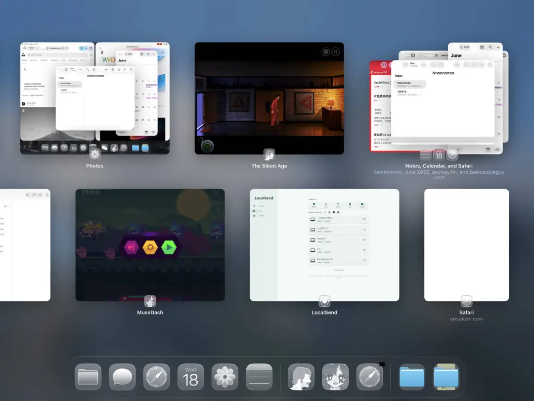 除了窗口化管理之外,iPadOS 26还带来了一个名为“Exposé”的功能,在前台有多个app窗口打开的时候可以通过上滑悬停的方式进入一个类似后台任务的界面。所有以窗口打开的app会集中显示在中间,而全屏的app则隐藏在屏幕左侧: