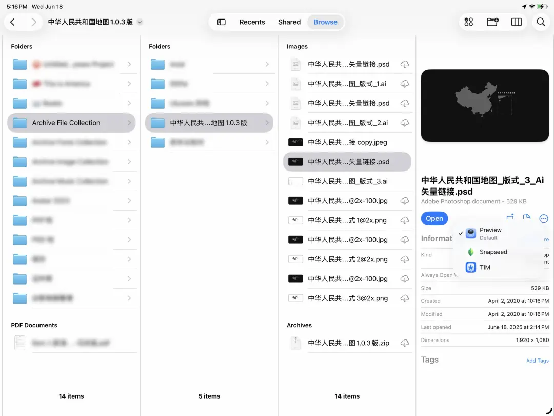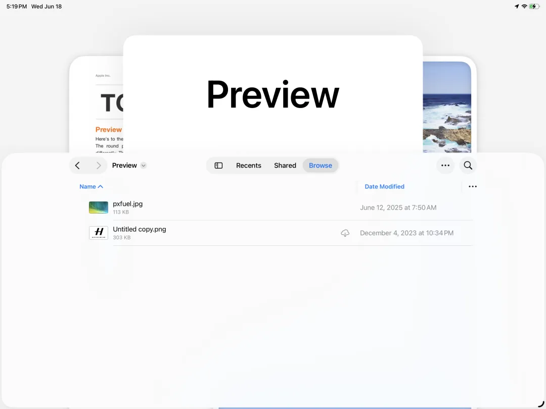 与此同时,macOS上的强力工具“预览”也终于来到了iPadOS 26中,并且拥有了一个全新的独立启动界面。文件app和iCloud云盘里面绝大多数常见的文件都可以直接用预览打开,甚至包括psd和ai文件,也支持进行简单批注或编辑导出: