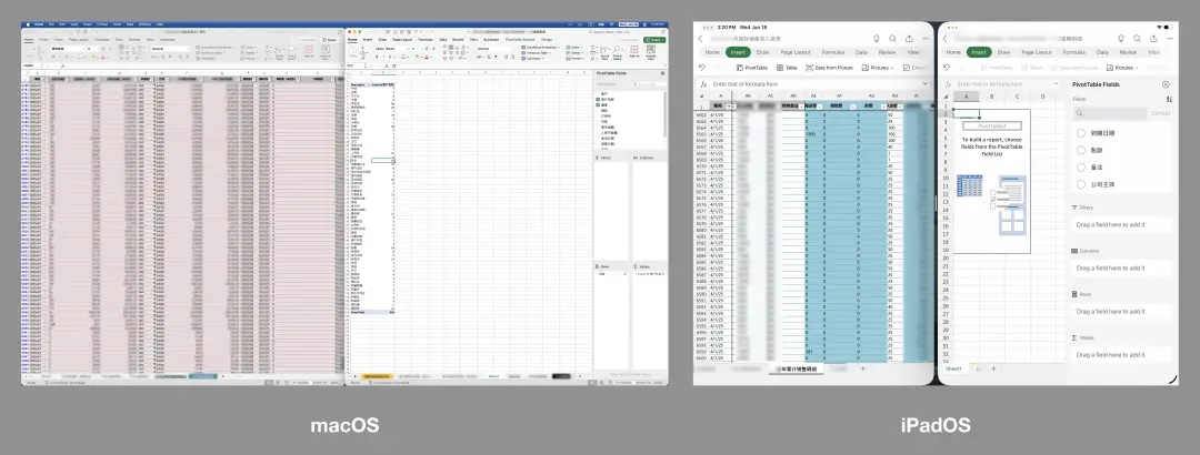 以最基础的用表格数据生成透视表(pivot table)为例,哪怕放在面积最充裕的13寸iPad上,Excel用于添加透视表过滤器的界面因为需要考虑触屏操作而将UI控件放的很大,一旦筛选项超过三四个,所需的点击和拖拽操作就会变成一种折磨。
