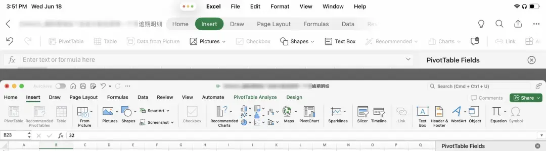 而相同的两张Excel表在macOS上的空间相比之下就充裕了许多,哪怕不考虑MacBook屏幕尺寸、缩放比例之类的要素,仅从工具栏的显示效率来说,只需要考虑键鼠的macOS就比iPadOS高出了几个量级。