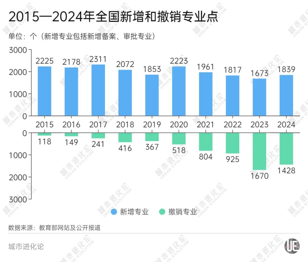 近两年,全国高校专业调整力度持续加大。数据显示,过去十年,我国共撤销6636个高校本科专业点,其中仅2023年、2024年撤销数量就达到3098个,占过去十年撤销数量的一半左右。