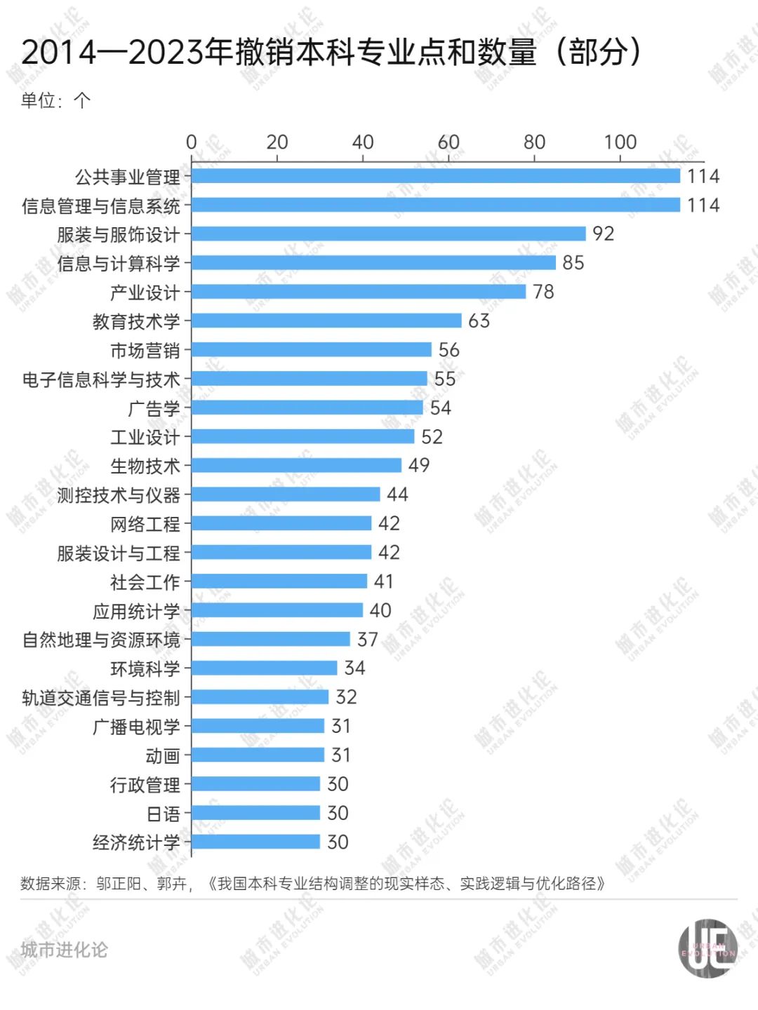 另据《我国本科专业结构调整的现实样态、实践逻辑与优化路径》一文披露,2014~2023年,公共事业管理、信息管理与信息系统、服装与服饰设计、信息与计算科学、产品设计、教育技术学、市场营销、电子信息科学与技术、广告学、工业设计等本科专业点撤销最多,数量均在50个以上。