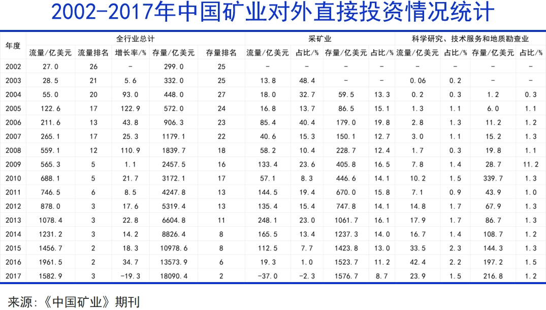 数据显示,2003年中国矿业对外投资额仅为13.8亿美元,到了2013年,这一数字已增至248.1亿美元,采矿业成为我国对外投资最活跃的领域之一。参与主体也从国企逐步扩展至部分实力民企,相关企业通过参股、并购、技术合作等方式进行海外资源储备。