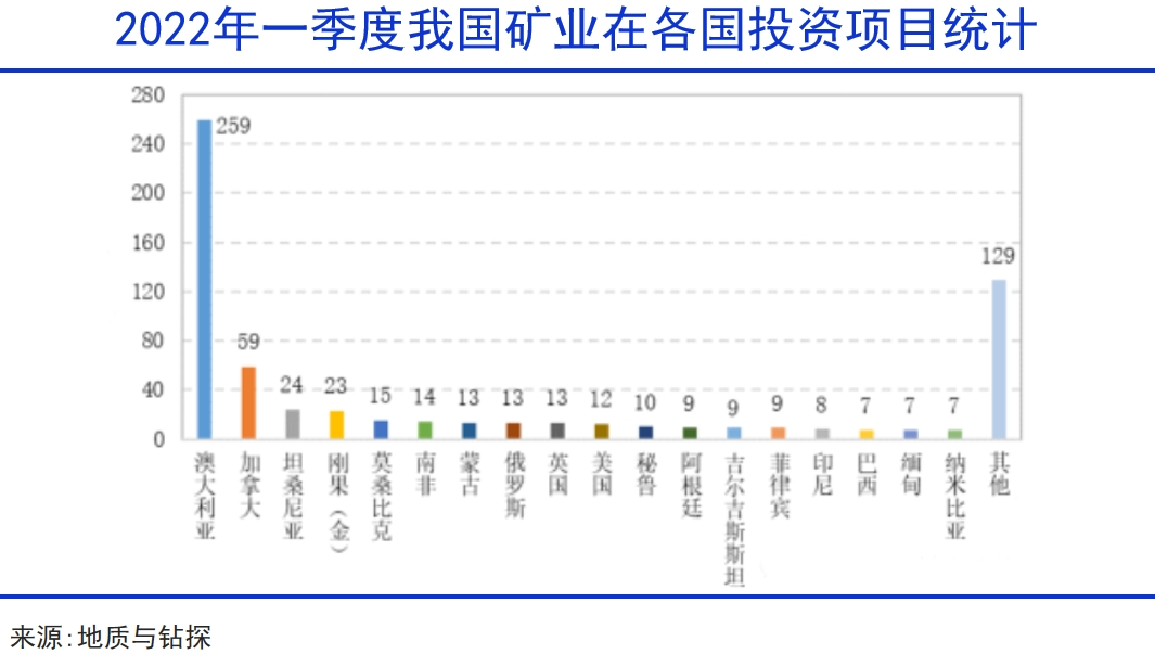 MSP的一些国家中不乏过去中国矿产企业的投资高地。比如澳大利亚、加拿大,长期以来都是中国矿企出海的热门目的地。根据统计,截至2022年一季度,我国在澳大利亚投资项目为所有国家最多,为259个,加拿大第二,为59个。