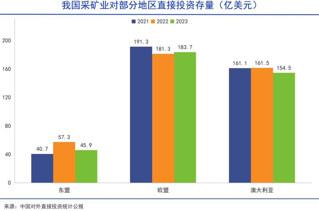 中国对外直接投资公报显示,2021~2023年间,我国采矿业对欧盟、澳大利亚投资整体下行,但对东盟的投资整体在增加。同时,据多方报道,中国在非洲的权益矿布局也在提速,且在从仅投资上游矿产向投资整条产业链的方向演进。