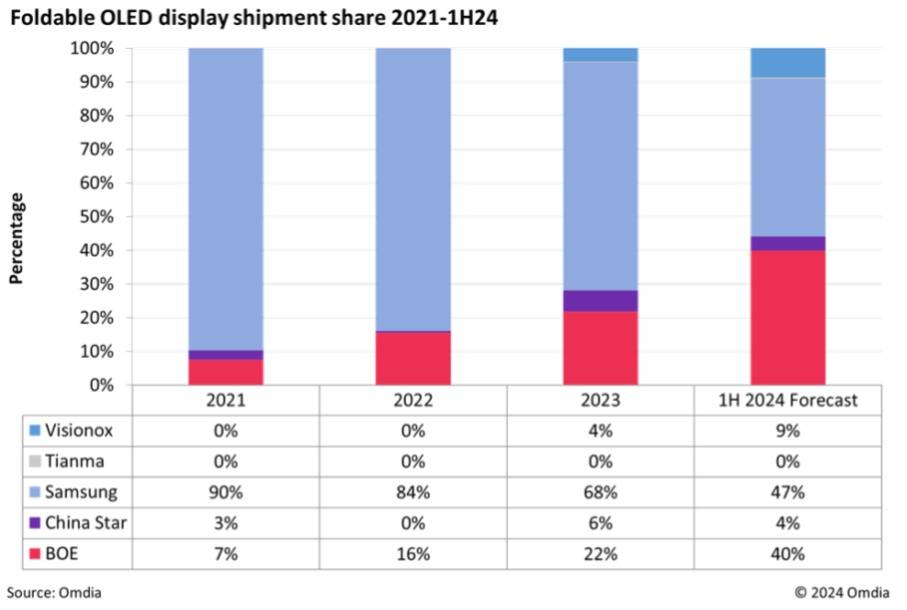 截止到2024年上半年的可折叠OLED面板市场份额,中国厂商已经超越三星。图源Omdia