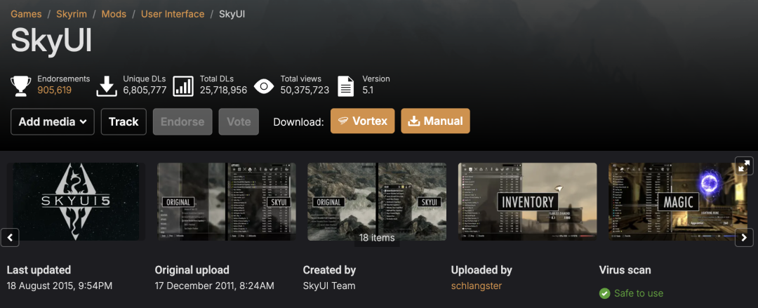 有个《上古卷轴5》的界面美化MOD,把原版游戏那个堪称垃圾的界面收拾得干净又方便,它的总下载量高达2571万。
