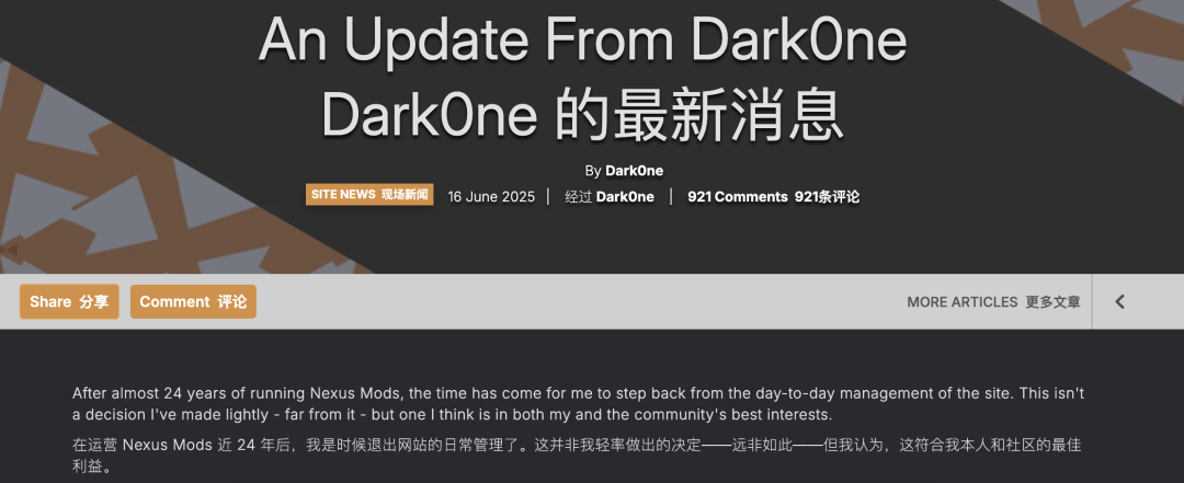 所以,为了Make N网Great Again,他找了几个和他一样热爱MOD的人接手。自己还会在N网工作,但不再是那个为决策最终拍板的负责人了。
