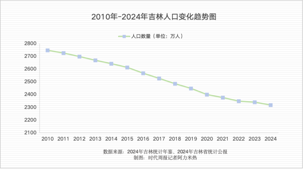 数据显示,吉林省人口于2010年达到峰值后,此后一直处于下跌状态。2010~2024年,吉林省人口数从2746.6万下降至2317.31万,缩减429.29万人,若以2020年为界,其十年下降的人口数大约400万人。