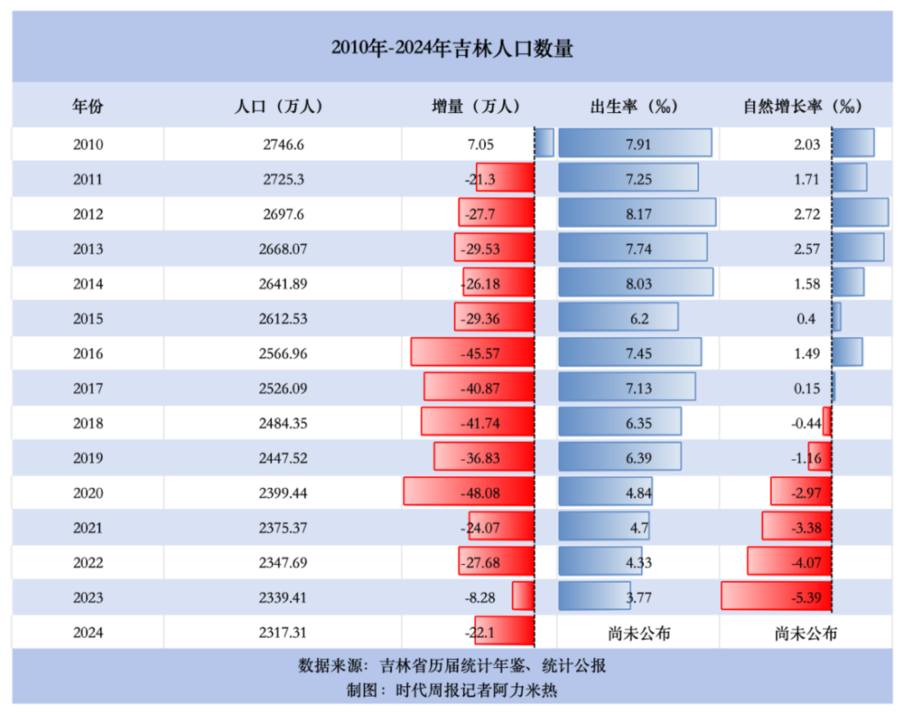 时代周报记者根据统计年鉴及统计公报数据的推算发现,吉林省早期以人口流出为主,目前已逐渐转向以人口自然减少。