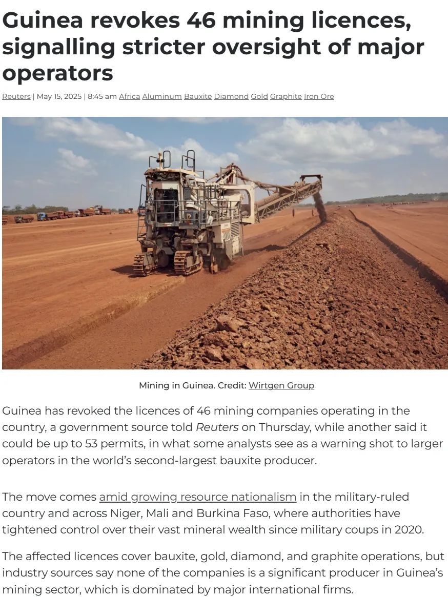 几内亚也正在重演同样的剧本。今年5月,过渡军政府领导人敦布亚将军通过电视台发布总统令,大规模撤销已有采矿权,据称被撤销的矿证超过100宗,涵盖多个铝土矿项目。