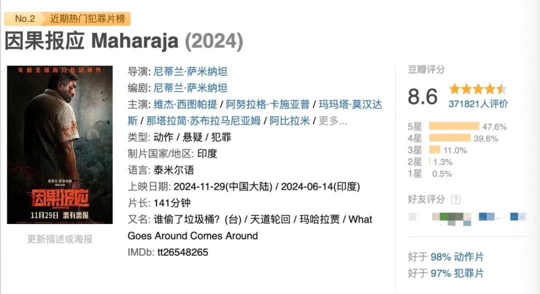 《因果报应》在印度上映不到一个月就上了Netflix,部分中国网友看过盗版资源后,给其打出了8.6的豆瓣高分,引发网络热议。时隔近半年,该片被引进中国,卖了近八千万票房,成为中国票房最高的南印度电影。