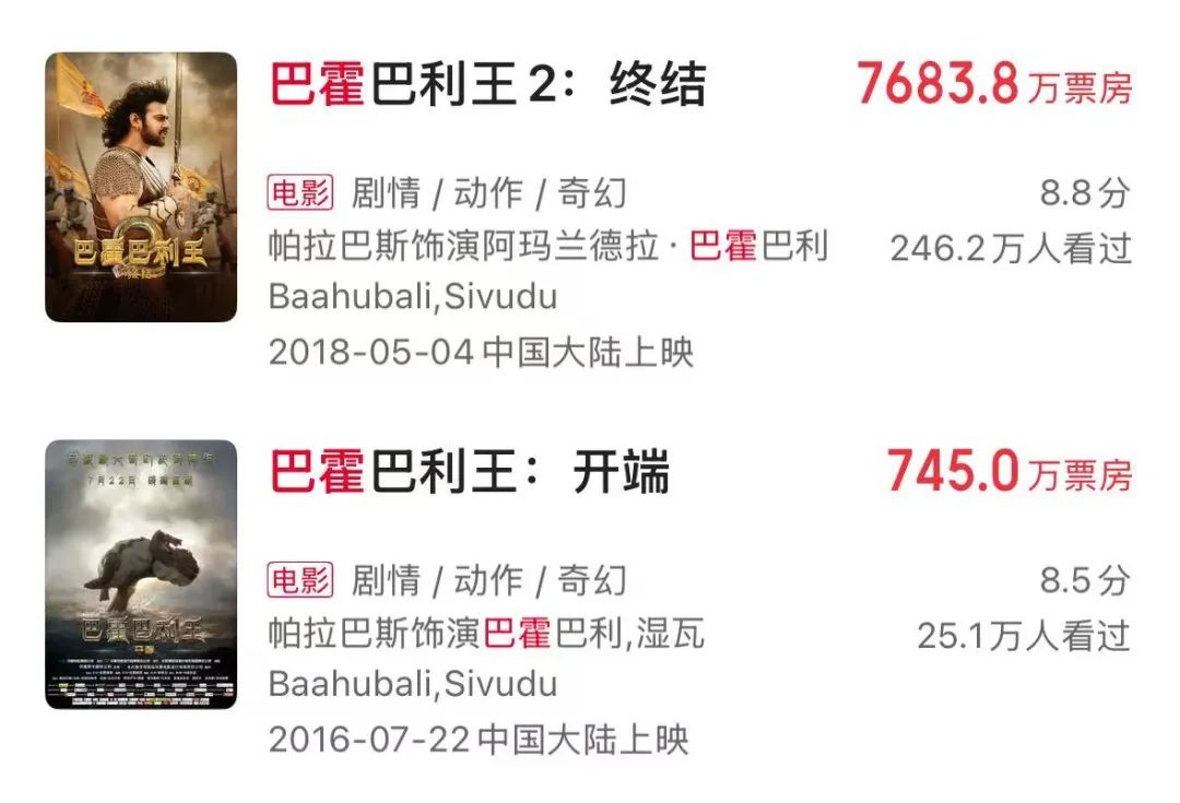 相较于宝莱坞电影,中国观众对南印度电影的接受度其实略差一些。曾经引进的口碑片《巴霍巴利王》两部,第一部卖了700万,第二部卖了7000万。《普什帕》第一部口碑更差,豆瓣评分只有6.8分,第二部看过的观众寥寥无几,被豆瓣网友称为“抽象神片”。