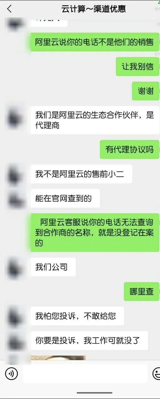 之后在阿里云平台进行了投诉,阿里云客服给的回应是,无法查到号码是阿里云第三方公司的,因此无法办理,用户需要提供号码的对应公司,证明这是阿里第三方服务公司。李明花了两天时间,查到此前170号码对应的公司,李明表示可以看到该公司向运营商出具了和阿里云的合作协议。李明再向阿里云客服反馈,阿里云回访电话说,第三方公司拒绝透露从什么渠道获取用户信息,因此阿里云无法处理,“阿里云客服还说这就是最终结果,就算我再申诉都没用”。