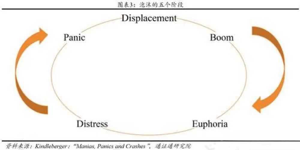 不妨参考经济学家查尔斯·P·金德尔伯格曾提出的资产泡沫的五阶段模型:变革(Displacement)、繁荣(Boom)、亢奋(Euphoria)、困境(Distress)和恐慌(Panic)。
