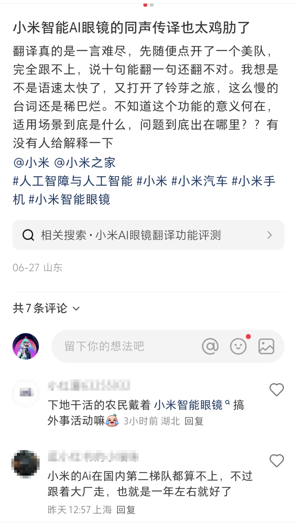 但作为初代产品的小米AI眼镜,目前的局限也很明显:AI还有些智障。