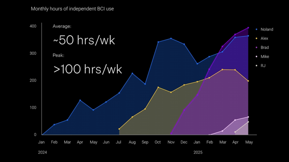 据介绍,目前Neuralink的受试者已经达到7人,其中涵盖4名脊髓损伤患者与3名肌萎缩侧索硬化症(ALS)患者,受试者们平均每周使用设备时长约50小时,峰值超100小时,几乎只要是清醒的时间都在用。