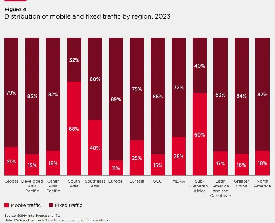 基于GSMA在2024年报告统计,欧洲数据流量的89%由有线网络承载,移动数据流量占比仅有11%。然而,代表移动通信行业的GSMA坚持认为,考虑到移动基站的覆盖范围远远大于Wi-Fi等无线局域网,不能简单地通过比较移动网络和Wi-Fi传输的流量多少决定6GHz频谱的划分。