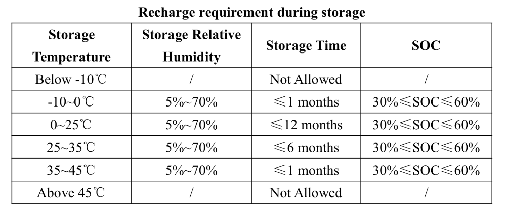 最关键的,在用户端,对于三元正极、钴酸锂正极的充电宝等产品而言,不要让电池处于充满电状态持续存放至关重要。下表是国外某品牌的储能装置储存条件要求。