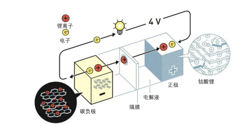 图1 钴酸锂作为正极、碳为负极的锂离子电池放电示意图。图源:参考文献[1]