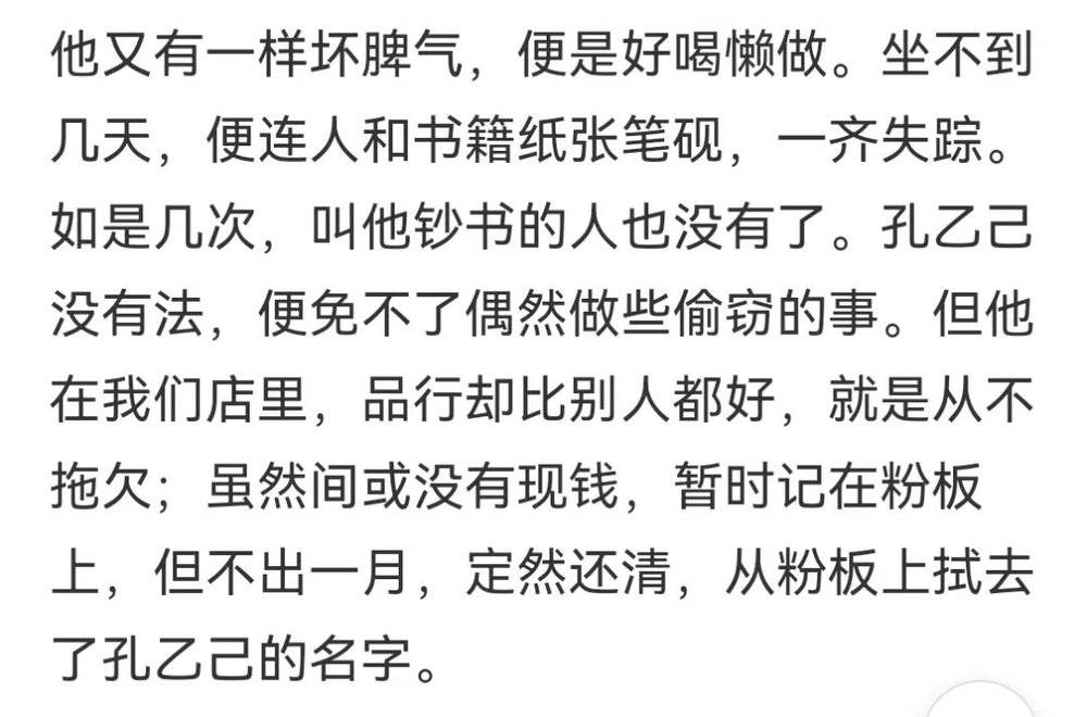 但有一说一,我自从中学之后,就没完整看过《孔乙己》的原文。孔乙己的形象以梗和定型文的形式活在我心中。前一阵子,我把孔乙己的原文又看了一遍,发现虽然网友经常用孔乙己来代指小镇做题家,实际上孔乙己和做题家有本质区别。