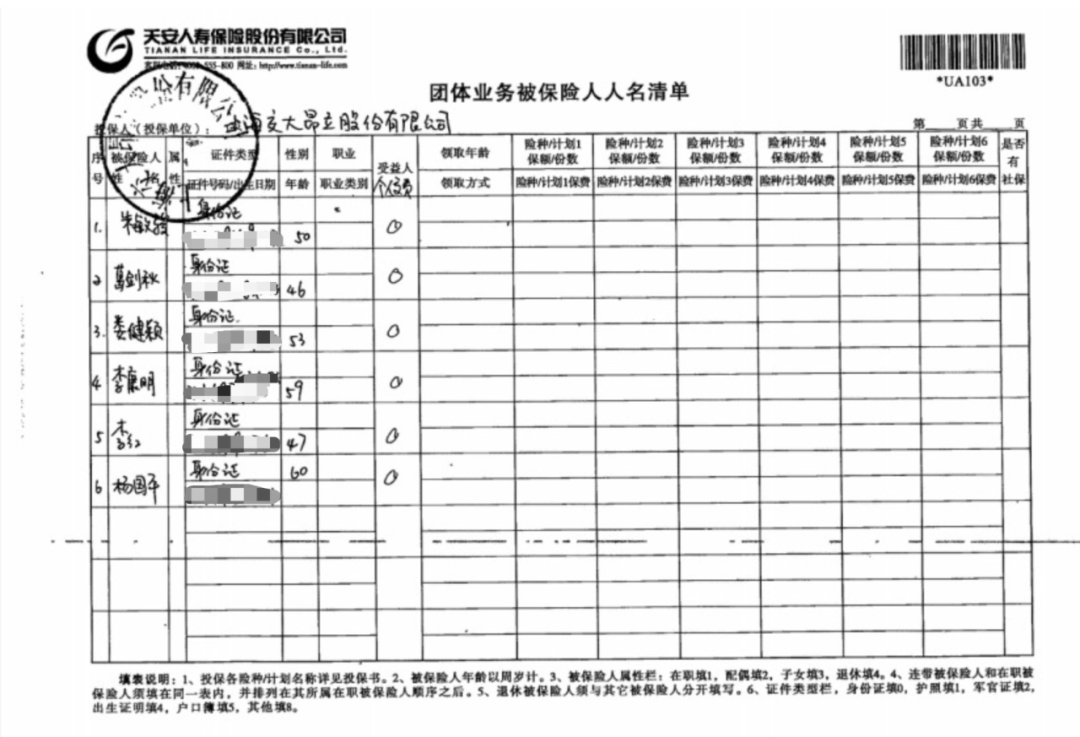 另据嵇霖提供的自天安人寿获取的团体业务被保险人人名清单显示,该保险的被保险人为朱敏骏、娄健颖、李康明、李红、杨国平、葛剑秋(时任董事、常务副总裁)等六人。受益人个人交费一栏,均标注为“0”。在保费来源一栏,“单位交费”及“单位交费与个人交费相结合”被勾选。
