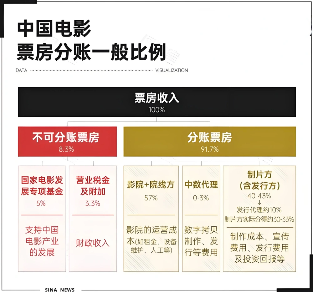 接下来,影院和院线从中拿走大头,一般是规定不超过57%。而制片方和发行方的总分成不低于43%。