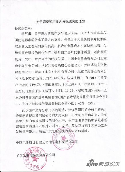 那年贺岁档前,中影、华谊、博纳、星美、光线五家电影制作发行公司联合发布了一个通知。要求自《一九四二》、《一代宗师》等9部贺岁片起,跟院线的分账比例由43%上涨到45%。
