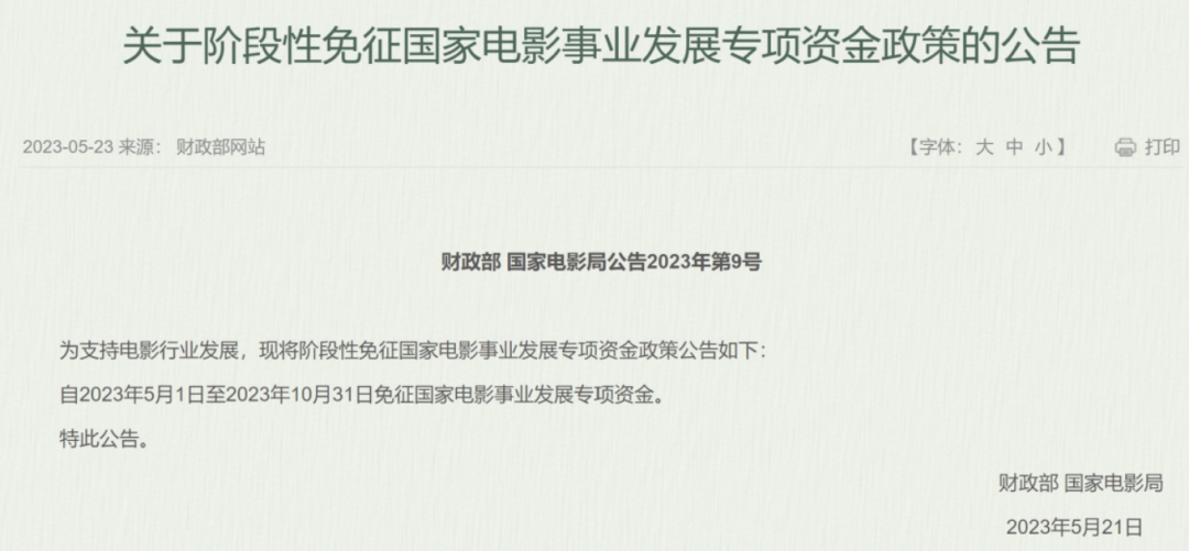 此前2023年5月到10月这两个暑期档和国庆档的电影,国家就减免了电影专项资金的征收。