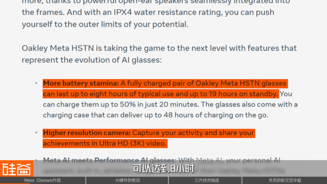 最后,电池续航也是一大问题。用户对Meta Ray-Ban最大的诟病是耗电过快。虽然Oakley已对续航进行了提升,但8小时的续航对于持续高强度的户外运动还是有点悬。当下的AI眼镜,既要实现轻量、佩戴舒适,又要保证电量能应对全天候佩戴,这还是短期内比较难攻克的问题。