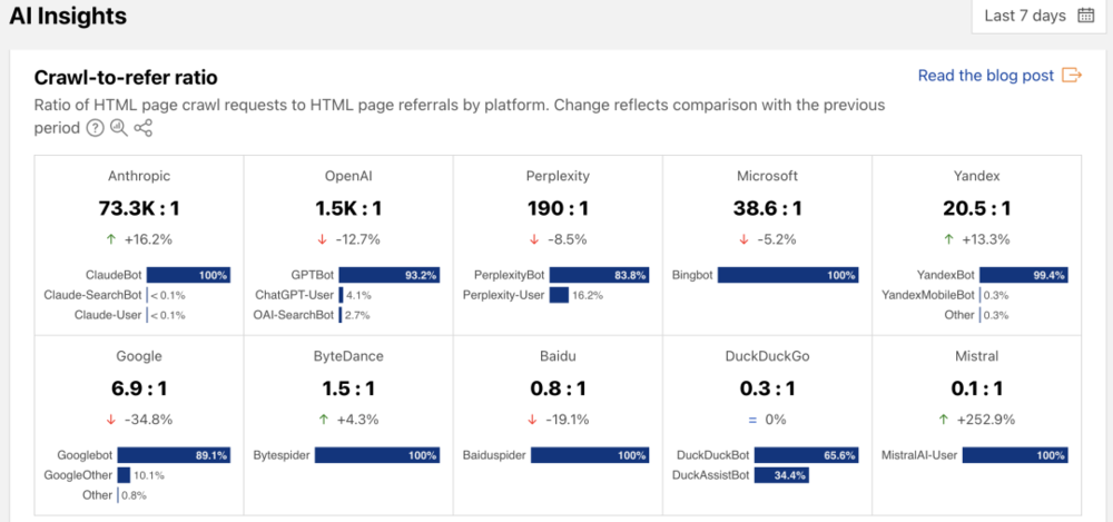 Cloudflare 2025年7月的最新数据显示:谷歌的爬虫大约每6至7次抓取给网站带回1次点击,而OpenAI则是1500次才换来1次跳转,Anthropic的比例甚至更夸张,高达73300次换1次。
