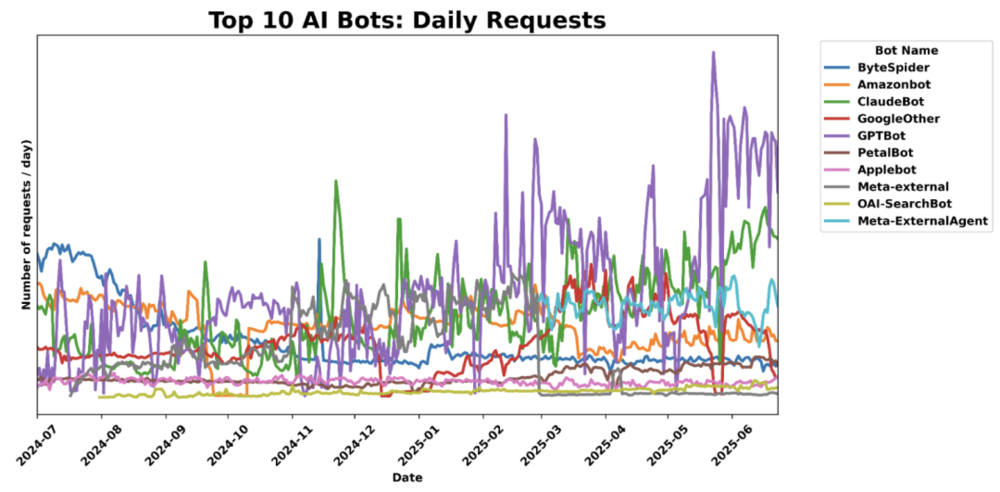活跃的大厂AI爬虫机器人|图片来源:Cloudflare