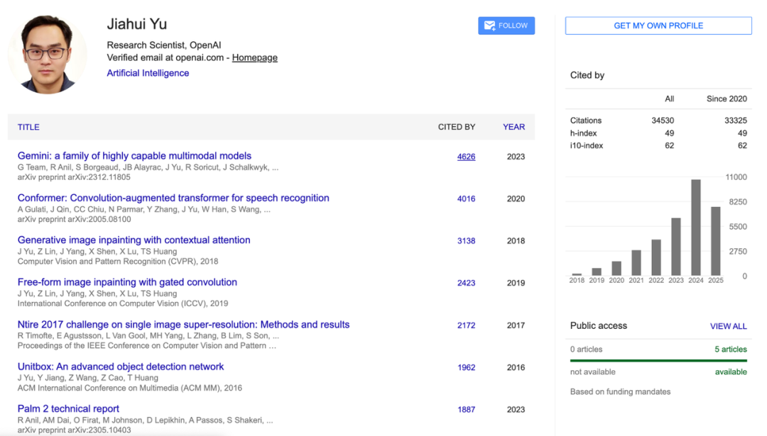Jiahui在Google学术上总引用次数超过34500次,h指数达49,代表性研究成果包括图文对齐基础模型CoCa、文本生成图像模型Parti、神经网络可伸缩设计BigNAS,以及广泛应用于Adobe Photoshop的图像修复技术DeepFill v1和v2等。