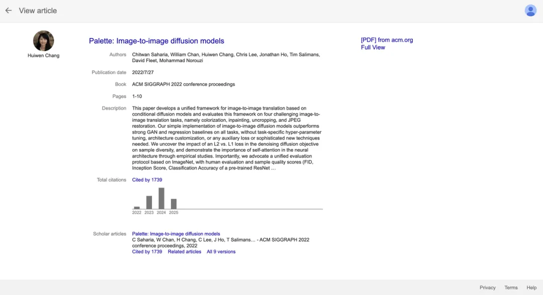 此外,她也是扩散模型顶级论文《Palette:Image-to-image diffusion models》的联合作者之一。