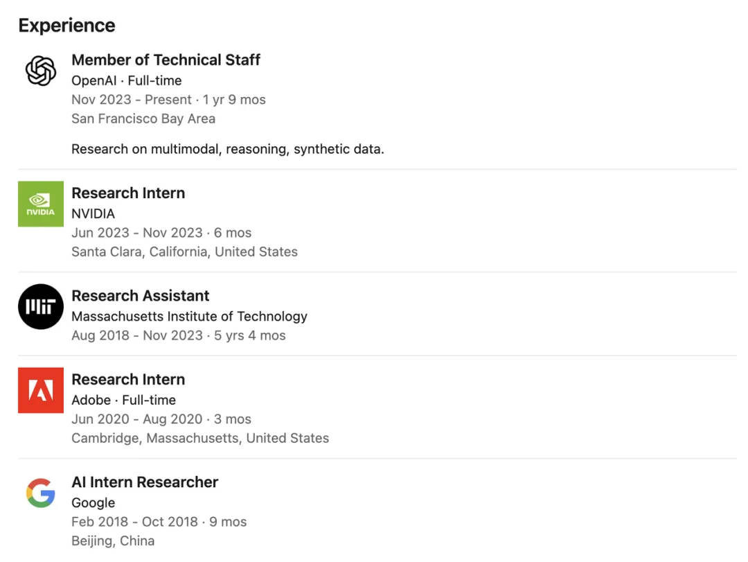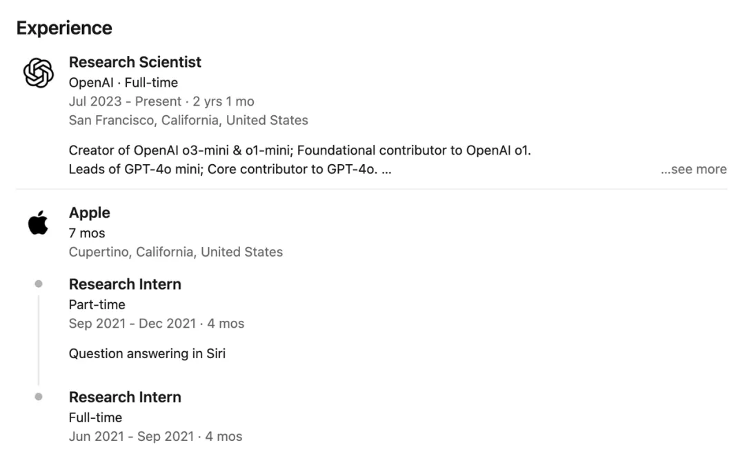在加入OpenAI之前,他曾在Google、微软以及英伟达有过多段实习经历,比如2021年在苹果担任实习研究员期间,参与Siri问答系统的搭建。