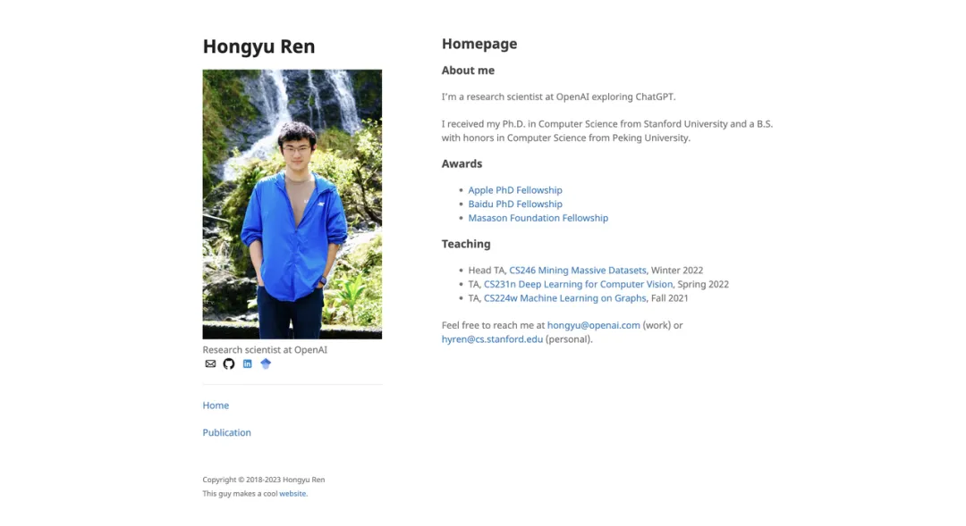 Hongyu Ren本科在北京大学获得计算机科学与技术学士(2014–2018)学位,随后在斯坦福大学获得计算机科学博士(2018–2023)学位。