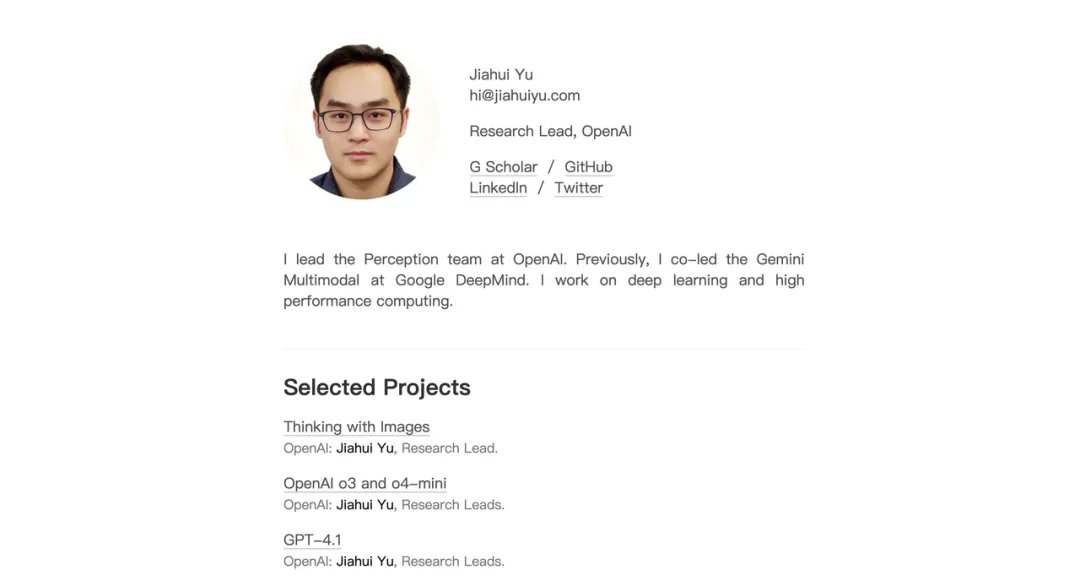 在OpenAI任职期间,Jiahui Yu担任感知团队负责人,主导开发GPT-4o图像生成模块、GPT-4.1、o3/o4-mini等重要项目,提出并落地了“Thinking with Images”感知体系。