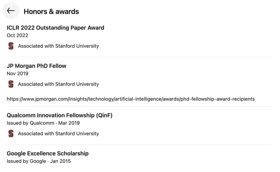 在学术表现上,他Google学术总引用数超过21,000次,h指数为25,曾获得过ICLR 2022 Outstanding Paper Award、JP Morgan PhD Fellow、Qualcomm创新奖学金(QinF)与Google Excellence Scholarship等多项奖项。